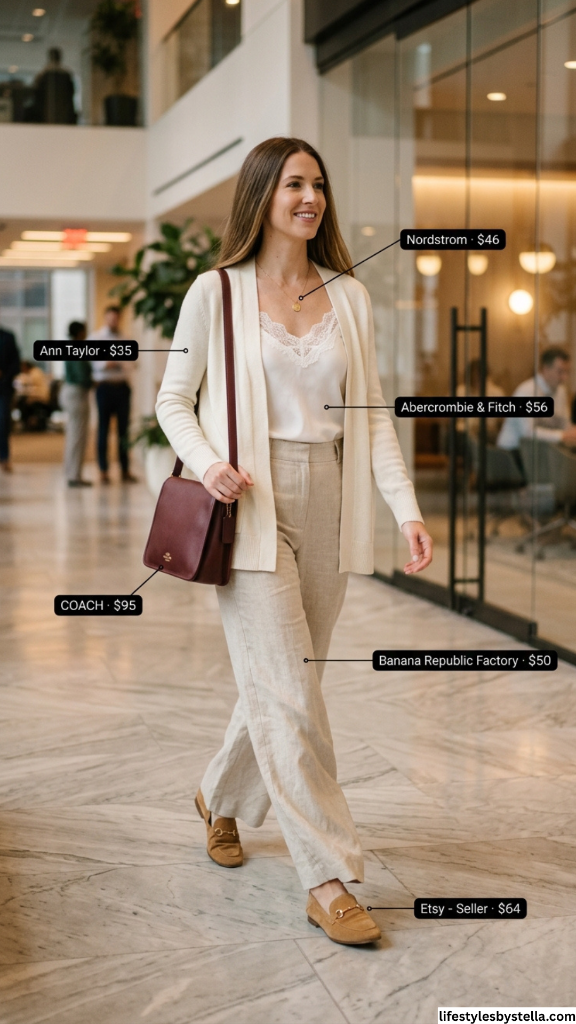 Shop This Look: The Cream Cardigan is from Ann Taylor at $35 — shop it here. The Satin Camisole from Nordstrom at $46 — grab it here. The Linen Trousers from Abercrombie & Fitch at $56 — find them here. The Coach Crossbody Bag at $95 — shop it here. The Wide-Leg Linen Pants from Banana Republic Factory at $50 — find them here. And the Tan Loafers from Etsy seller at $64 — grab them here.
