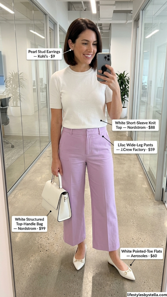 Shop This Look: The Pearl Stud Earrings are from Kohl’s at $9 — shop them here. The White Short-Sleeve Knit Top from Nordstrom at $88 — grab it here. The Lilac Wide-Leg Pants from J.Crew Factory at $59 — find them here. The White Structured Top-Handle Bag from Nordstrom at $99 — shop it here. And the White Pointed-Toe Flats from Aerosoles at $60 — find them here.