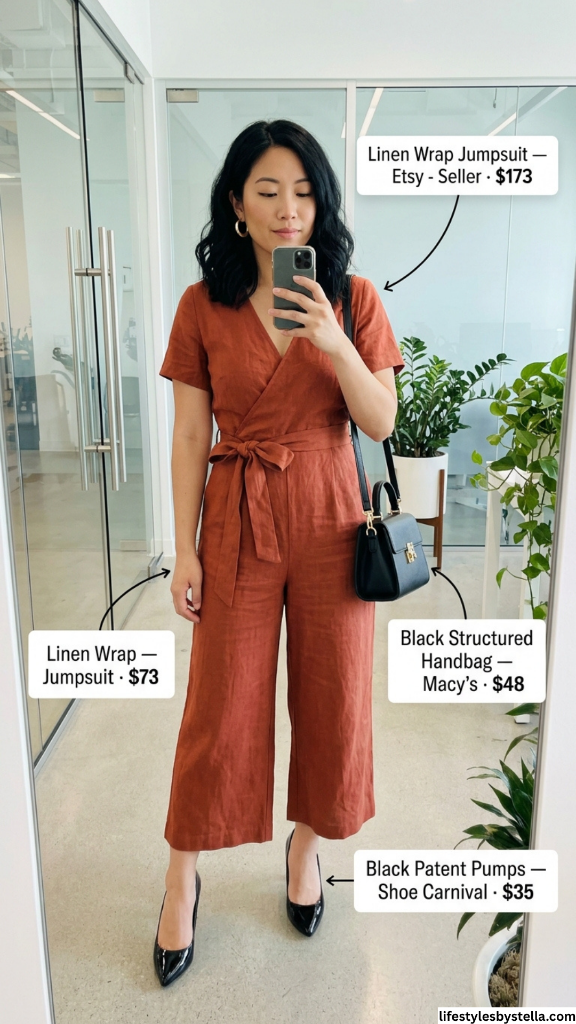 1. Rust Linen Wrap Jumpsuit — The Ultimate Summer Office Outfit Statement