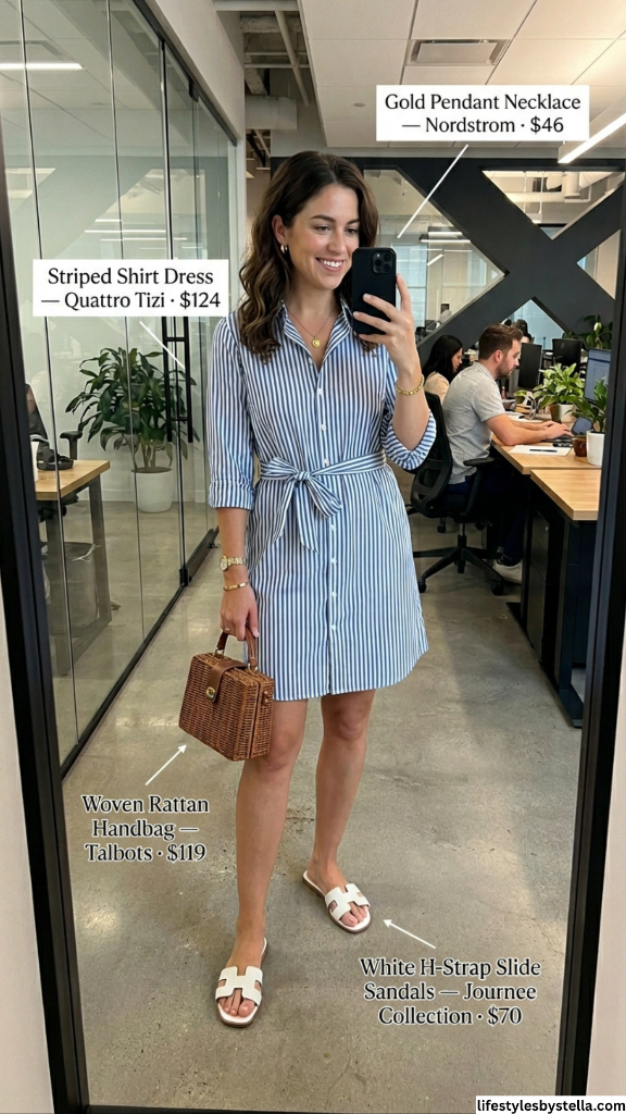 A striped shirt dress is the kind of piece that makes you wonder why you own anything else during summer. This blue-and-white version — with its relaxed collar, rolled sleeves, and self-tie waist — embodies that European vacation energy but is completely workplace-appropriate. The stripes are classic, the cut is relaxed without being sloppy, and the cotton fabric breathes like it was designed specifically for July commutes. It’s one of those cool summer office outfits women can throw on without a second thought and still receive compliments all day long.