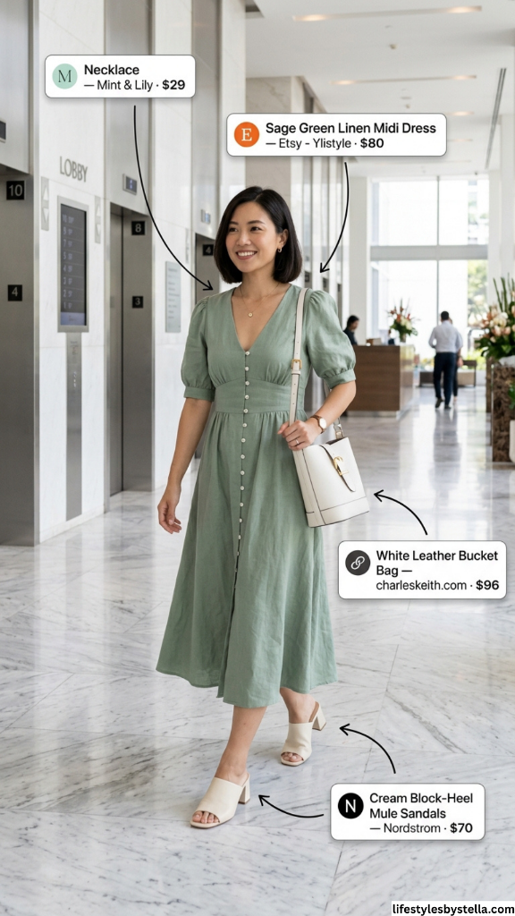 Shop This Look: The Sage Green Linen Midi Dress is from Etsy seller Ylistyle at $80 — shop it here. The Necklace from Mint & Lily at $29 — grab it here. The White Leather Bucket Bag from Charles & Keith at $96 — find it here. And the Cream Block-Heel Mule Sandals from Nordstrom at $70 — shop them here.