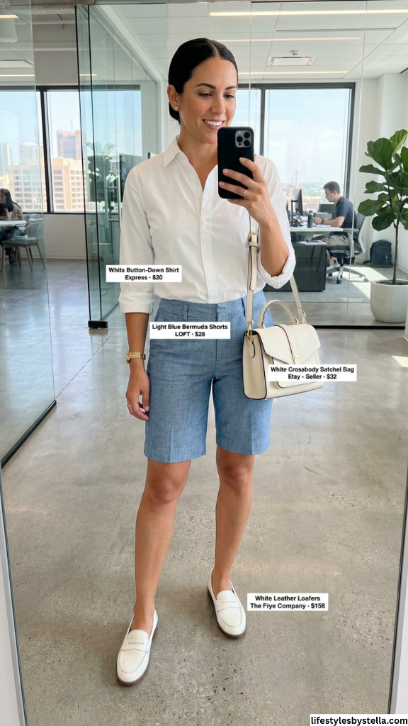 Shop This Look: The White Button-Down Shirt is from Express at $20 — shop it here. The Light Blue Bermuda Shorts from LOFT at $28 — grab them here. The White Crossbody Satchel Bag from Etsy seller at $32 — find it here. And the White Leather Loafers from The Frye Company at $158 — shop them here.