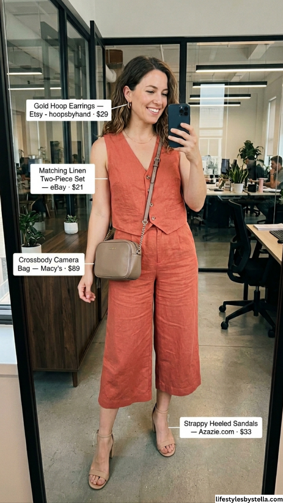Another matching set, but this one goes in a completely different direction — and I’m obsessed. This terracotta linen vest-and-wide-leg-pant combination has that effortless, slightly ’70s-inspired energy that makes getting dressed feel exciting rather than obligatory. The vest silhouette is sleeveless with a V-neck and button detail, which gives the outfit structure without the coverage of a full blouse. It’s fresh, it’s modern, and it’s the kind of summer office outfit idea that your coworkers will screenshot and save.