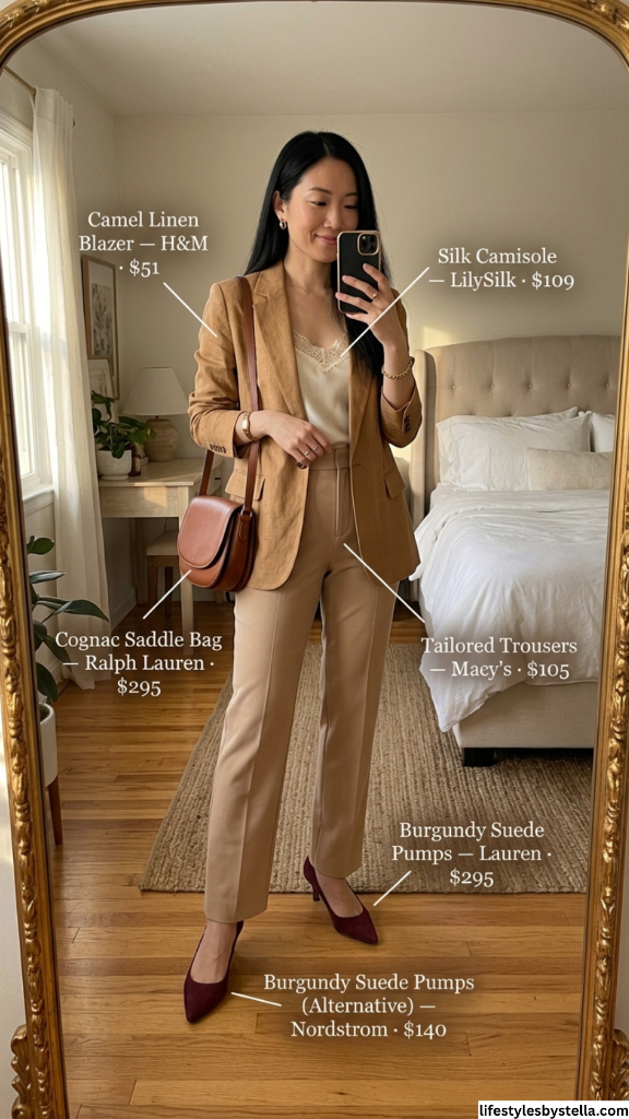 Shop This Look: The Camel Linen Blazer is from H&M at $51 — shop it here. The Silk Camisole from LilySilk at $109 — grab it here. The Cognac Saddle Bag from Ralph Lauren at $295 — find it here. The Tailored Trousers from Macy’s at $105 — shop them here. The Burgundy Suede Pumps from Lauren Ralph Lauren at $295 — find them here. And a more budget-friendly Burgundy Suede Pump alternative from Nordstrom at $140 — shop it here.