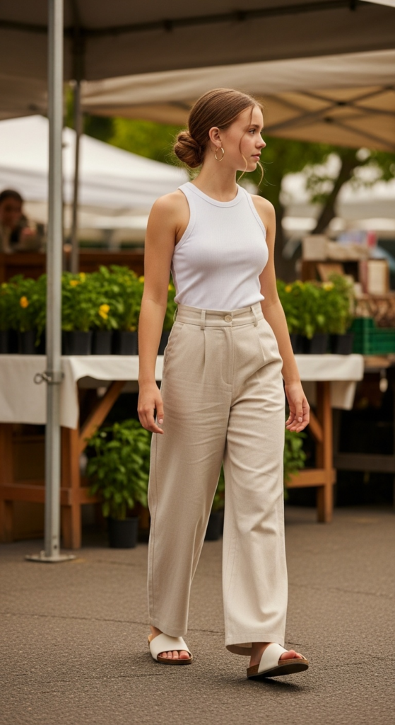 Suggested alt text: Teen summer outfits idea with oatmeal wide-leg linen pants, white ribbed tank top, and white slides at an outdoor farmer’s market.