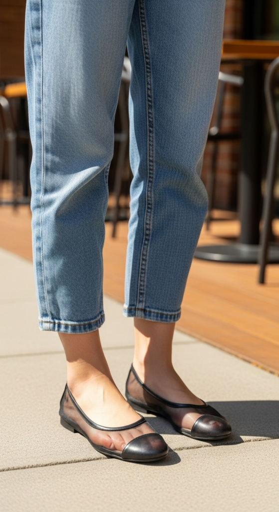 Suggested alt text: Teen summer outfits shoe detail featuring black mesh ballet flats with cropped relaxed jeans on a sunny sidewalk outside a café.
