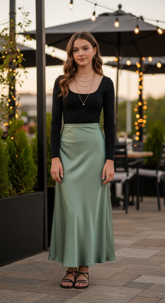 Suggested alt text: Teen summer outfits look with sage green satin maxi skirt, black fitted bodysuit, layered gold necklaces, and black strappy sandals.