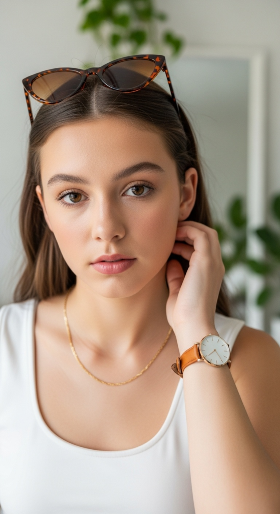 Suggested alt text: Teen summer outfits accessories close-up with delicate gold necklace, tan leather watch, tortoiseshell sunglasses, and a white scoop-neck top.