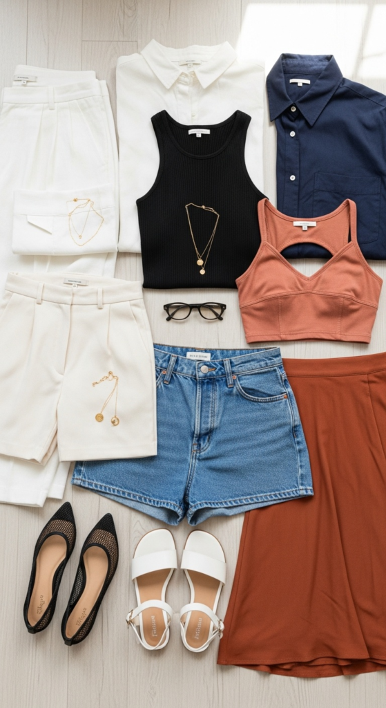 Suggested alt text: Teen summer outfits capsule wardrobe flat lay with white and oatmeal linen, black tank, denim shorts, terracotta top, rust skirt, gold jewelry, mesh flats, and white sandals.