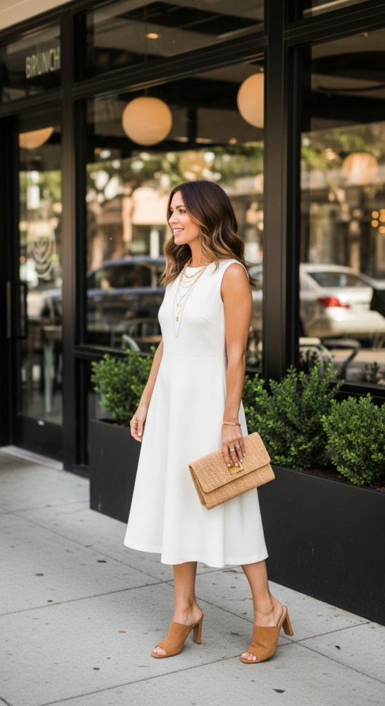 One of my favorite formulas for everyday tenniscore outfits is a white tennis-style dress paired with heeled mules, layered necklaces, and a straw or leather clutch. It keeps the ease of the original inspiration, but it looks like something you’d actually wear to brunch, a weekend lunch, or a summer city walk.