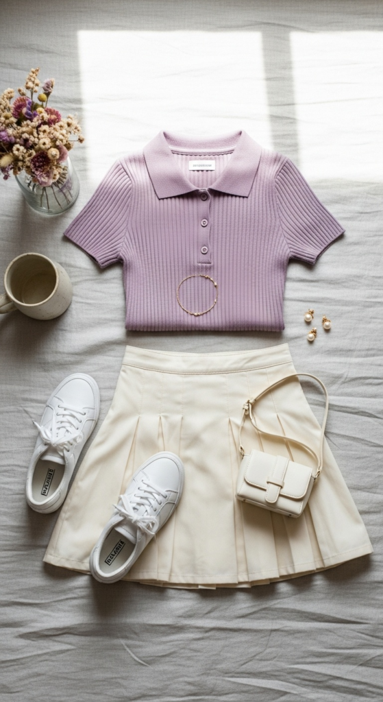 Suggested alt text: Tenniscore outfits flat lay with a dusty lavender polo top, cream pleated skirt, white sneakers, and delicate accessories
