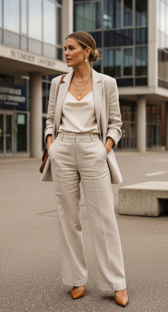 Relaxed blazers paired with matching or coordinating trousers — but in softer fabrics and warmer tones than traditional office wear. Think an oatmeal linen-blend suit with a silk cami underneath.