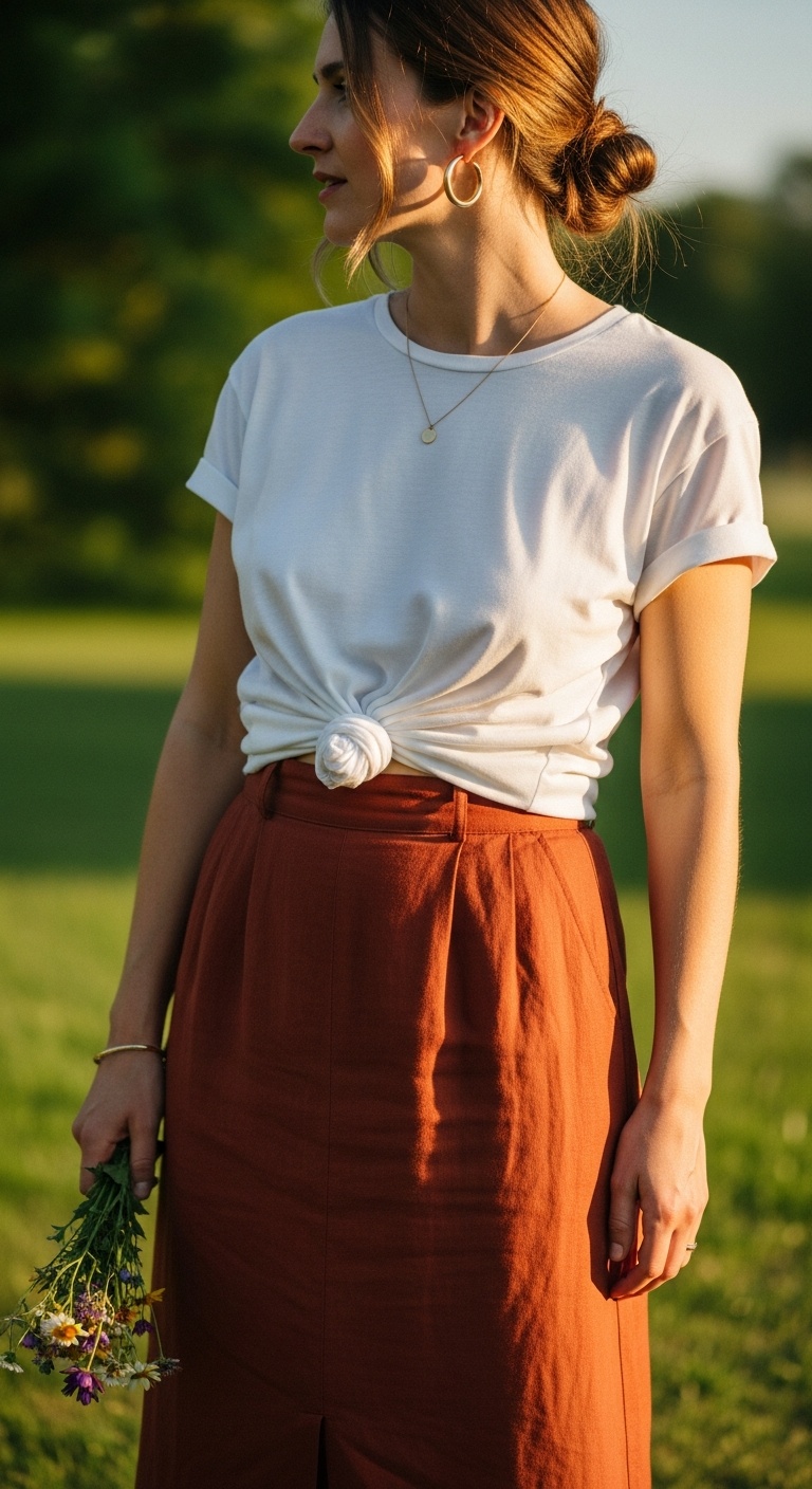 Alt text suggestion: What to wear to a picnic with a white cotton T-shirt and rust linen midi skirt in warm golden-hour lighting.