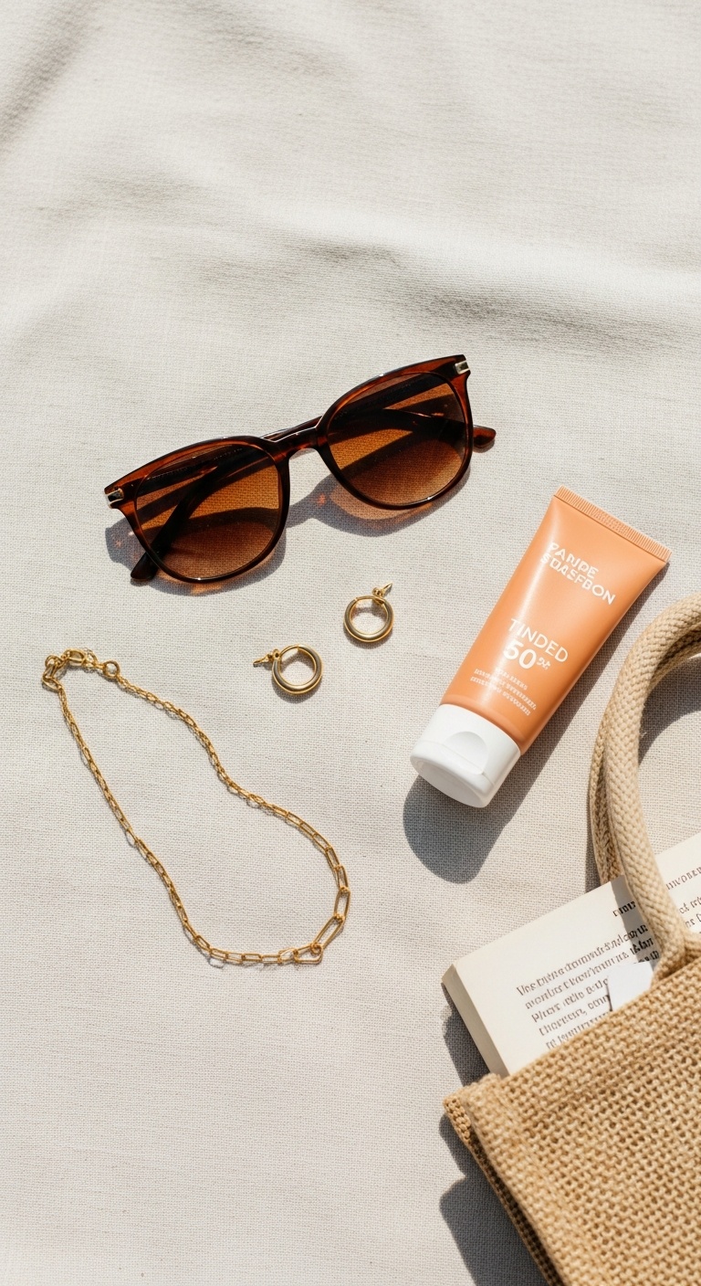 A woven tote, straw basket, or canvas bag is perfect because it is not precious. It can sit beside the blanket, carry sunscreen, and survive a little summer chaos. Sunglasses should fit well enough that you are not pushing them up every thirty seconds. Jewelry should stay simple. A thin gold chain, small hoops, or a delicate bracelet is enough.