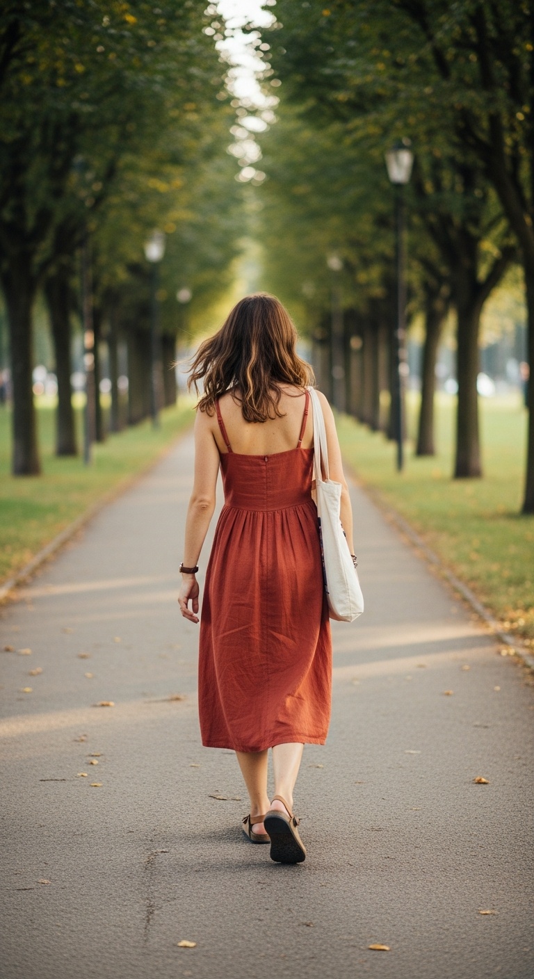 Alt text suggestion: What to wear to a picnic in a terracotta linen midi dress with comfortable broken-in sandals for an easy park walk.