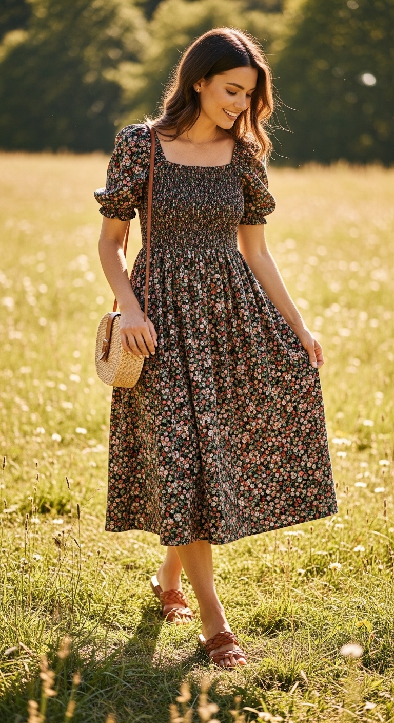 I especially love a dark floral print, soft puff sleeves, and a mid-calf hem. That length is key. If you are asking what to wear to a picnic and you know you will actually be sitting outdoors, a midi length is usually the sweet spot. You still see your shoes. You still get movement. But you are not constantly adjusting the dress every time the breeze picks up.