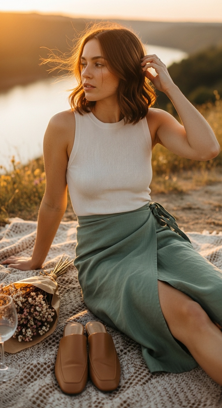 Alt text suggestion: What to wear to a picnic date with an off-white ribbed tank, sage green wrap skirt, and tan leather mules at golden hour.
