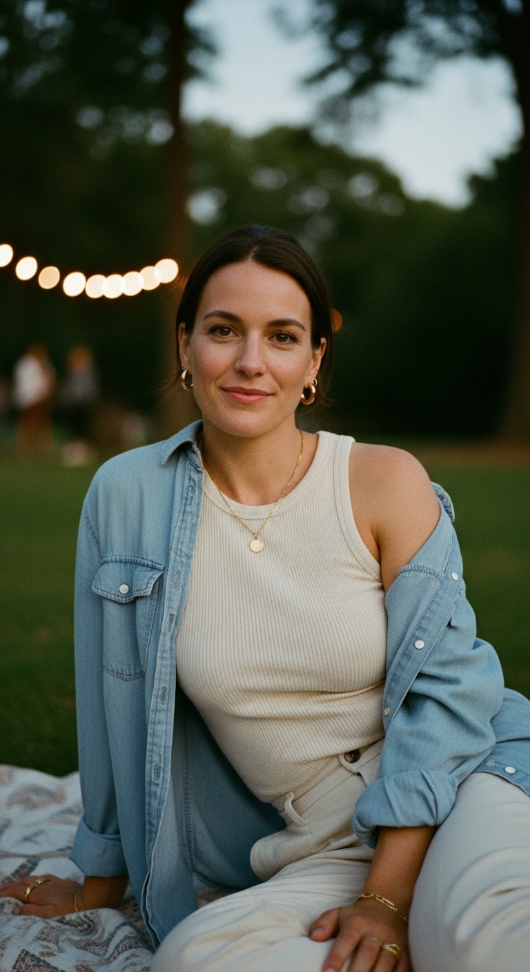 A picnic that starts warm can end cool very quickly, especially near water or once the sun drops. That is why I always bring an extra layer now. A chambray shirt, a linen button-down, a denim jacket, or even a large wrap makes a huge difference once the light changes.